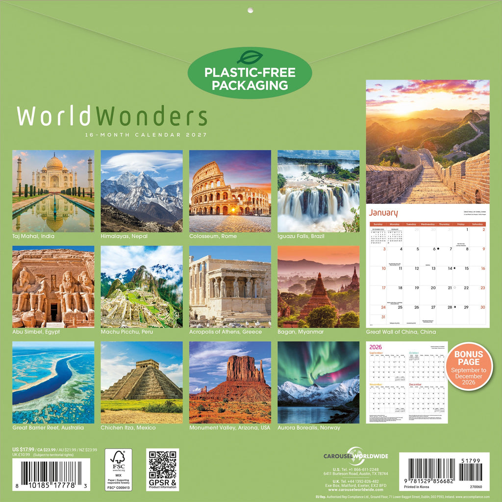 From the Taj Mahal in India, to The Great Wall of China, the World Wonders 2027 wall calendar celebrates some of the most unique and breathtaking places on our planet. Each month has a spacious date grid and a beautiful image of one of the wonders of the world. This calendar is free of plastic packaging.